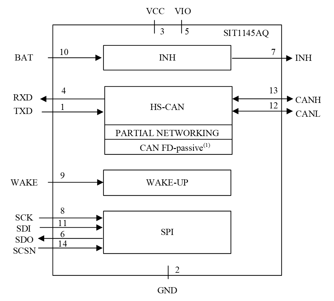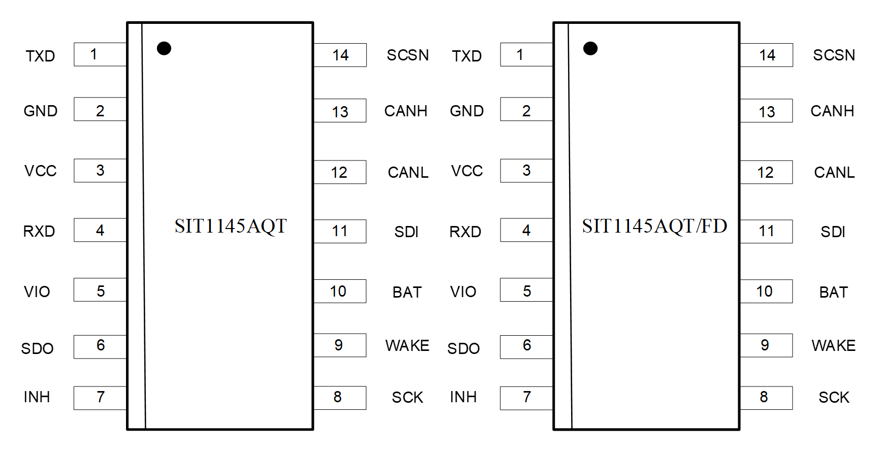 SIT1145AQ總線端口耐壓可達(dá)-58V至+58V,接收器共模輸入電壓達(dá)到-12V至+12V,VBAT工作電壓5.5V~40V, 耐壓可達(dá)70V, 適用于 12V 或 24V 應(yīng)用系統(tǒng)。
