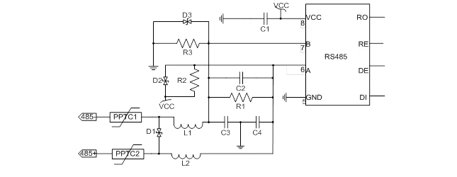 RS485通訊接口芯片廣泛應(yīng)用于各種智能儀表上,采用RS485接口的智能儀表不僅可以實(shí)現(xiàn)點(diǎn)對點(diǎn)的通信方式,還可以實(shí)現(xiàn)聯(lián)網(wǎng)功能,RS485為遠(yuǎn)程抄表提供了最可靠的抄表方式。RS485接口芯片的應(yīng)用非常廣泛,應(yīng)用環(huán)境各有不同,而智能儀表、工業(yè)控制等現(xiàn)場環(huán)境時常非常惡劣,RS485通訊端口需要做好靜電防護(hù)、雷擊浪涌防護(hù)、以及380V市電接入防護(hù)等,以避免智能儀表、工控主機(jī)的損壞。本文介紹幾種典型的RS485端口防護(hù)電路。