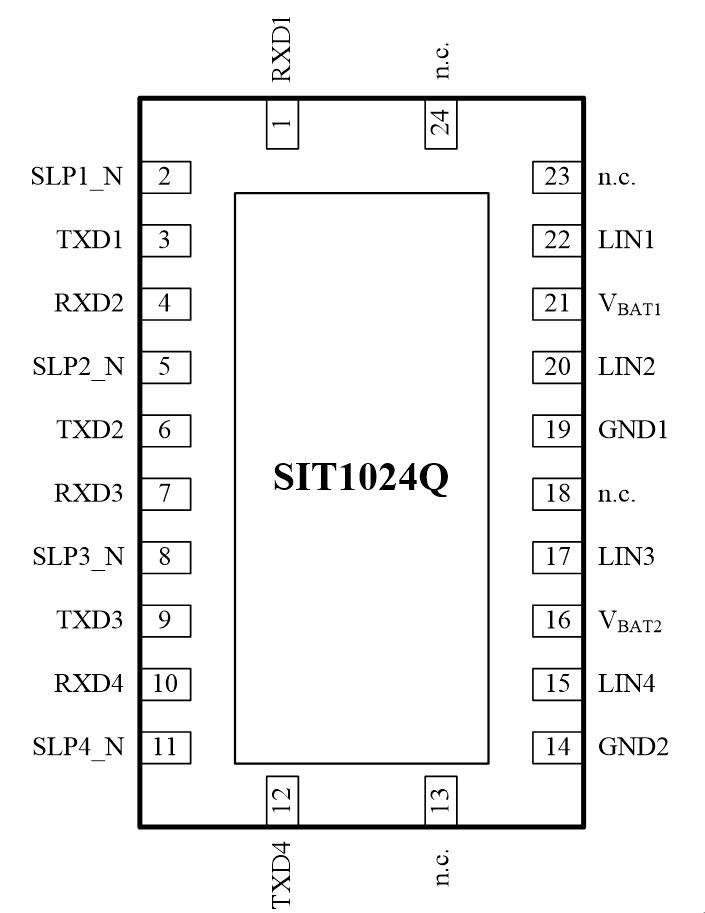 SIT1024Q是一款四通道本地互聯(lián)網(wǎng)絡(luò)(LIN)物理層收發(fā)器,符合LIN 2.0、LIN 2.1、LIN 2.2、LIN 2.2A、ISO 17987-4:2016 (12V) 和SAE J2602標(biāo)準(zhǔn)。主要適用于使用1kbps至20kbps傳輸速率的車(chē)載網(wǎng)絡(luò)。SIT1024Q通過(guò)TXDx引腳控制 LINx總線(xiàn)的狀態(tài),可將協(xié)議控制器的發(fā)送數(shù)據(jù)流轉(zhuǎn)換為具有最佳壓擺率和波形整形的總線(xiàn)信號(hào),以最大程度地減少電磁輻射發(fā)射(EME)。LIN總線(xiàn)輸出引腳具有內(nèi)部上拉電阻,僅當(dāng)用作主機(jī)節(jié)點(diǎn)時(shí),才需將LIN總線(xiàn)端口通過(guò)一個(gè)與二極管串聯(lián)的外部電阻上拉至VBATx。SIT1024Q通過(guò)LINx引腳接收總線(xiàn)上的數(shù)據(jù)流,并由接收器的輸出引腳RXDx將數(shù)據(jù)傳送到外部的微控制器。