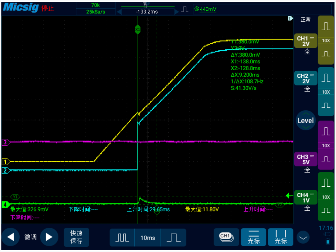 干擾幅值(綠色通道)由原來(lái)的2.8V降低為0.33V左右,此時(shí)INH(藍(lán)色通道)輸出高,各功能均能正常工作。
