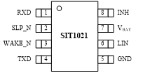SIT1021具有超低功耗休眠模式,芯片在休眠模式下,流過(guò)VBAT腳電流典型值僅為3uA;SLP_N腳控制芯片進(jìn)入正常工作模式和休眠模式,當(dāng)SLP_N腳為高電平時(shí),芯片進(jìn)入正常工作模式;當(dāng)SLP_N腳為低電平時(shí),芯片進(jìn)入休眠模式;SLP_N腳內(nèi)置弱下拉(國(guó)外同類(lèi)芯片一樣內(nèi)置弱下拉),較容易受外界干擾影響,上電后用手觸摸此管腳能夠引起芯片進(jìn)入正常工作模式;這樣如果在干擾比較強(qiáng)的應(yīng)用環(huán)境中SLP_N端口可能會(huì)受干擾被誤觸發(fā),造成功能不良。SIT1021管腳圖如下: