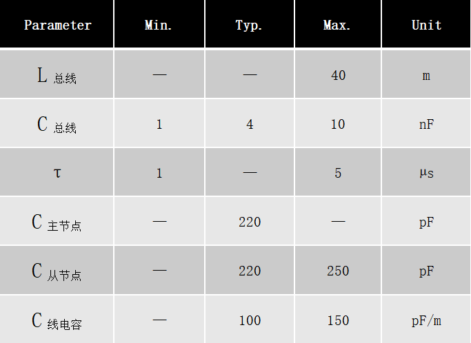 RC時(shí)間常數(shù)(τ)、主從節(jié)點(diǎn)電容(C主節(jié)點(diǎn)、C從節(jié)點(diǎn))、總線上的等效總電容(C總線)、線電容(C線電容)、總線長度(L總線):