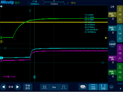 其中部分測試波形如下:(示波器通道1(黃色)接VIO,通道4(綠色)接VCC,通道2(藍色)CANH,通道3(紫色)接CANL)