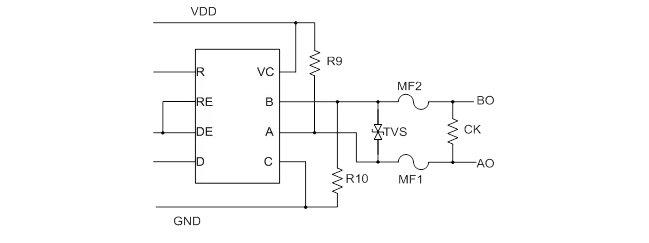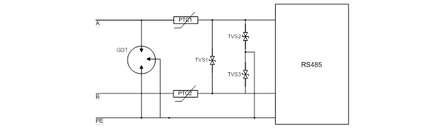 3,AB端口分別并聯(lián)熱敏電阻、TVS 到地,同時A,B之間并聯(lián)TVS器件的保護(hù)方案。